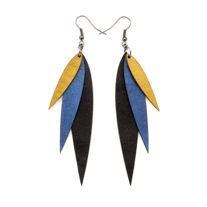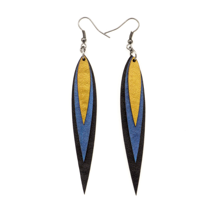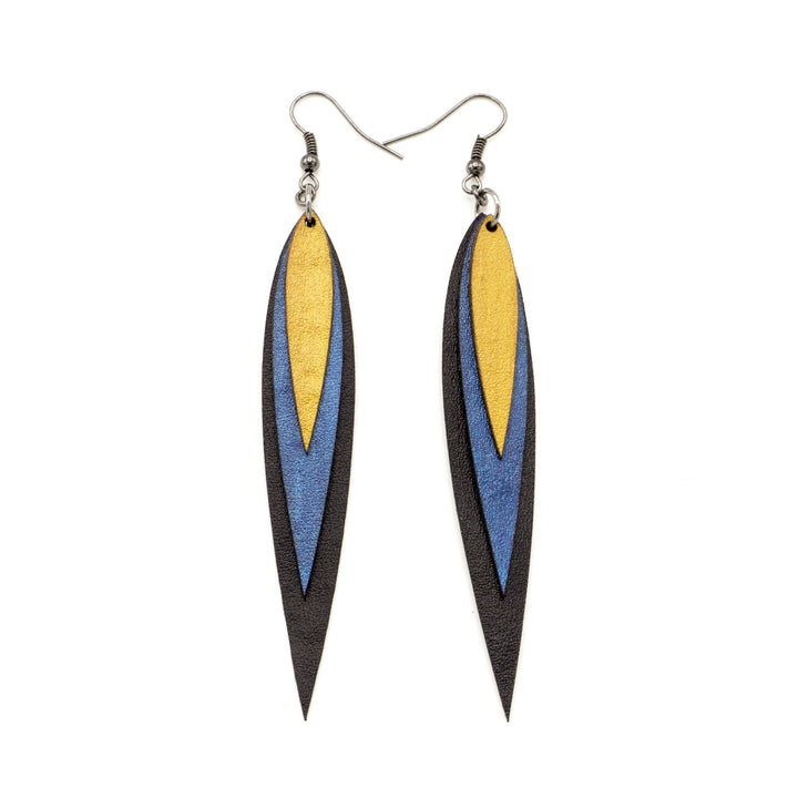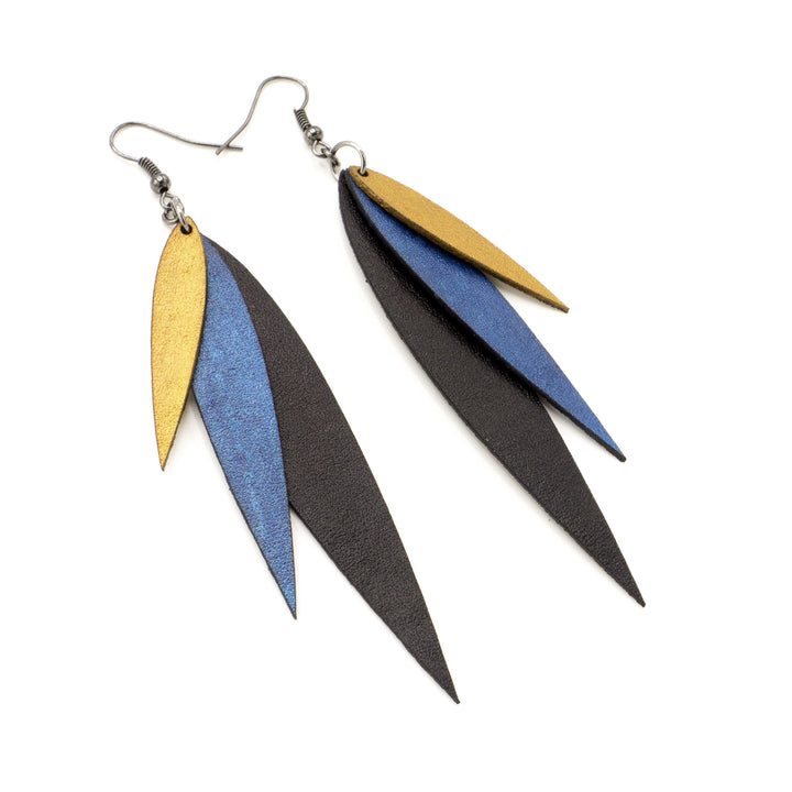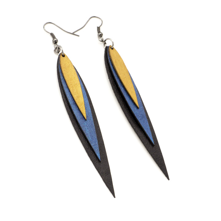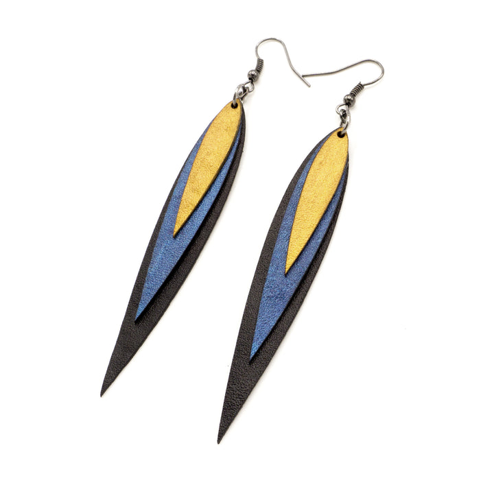 Large, sleek, and exciting! These are sure to enliven your personality! Colorful, lightweight, statement making earrings for the social provocateur. These beautiful, layered leather earrings are handmade and one-of-a-kind.