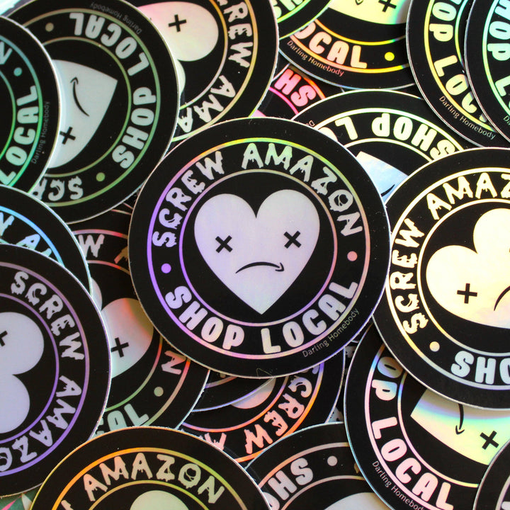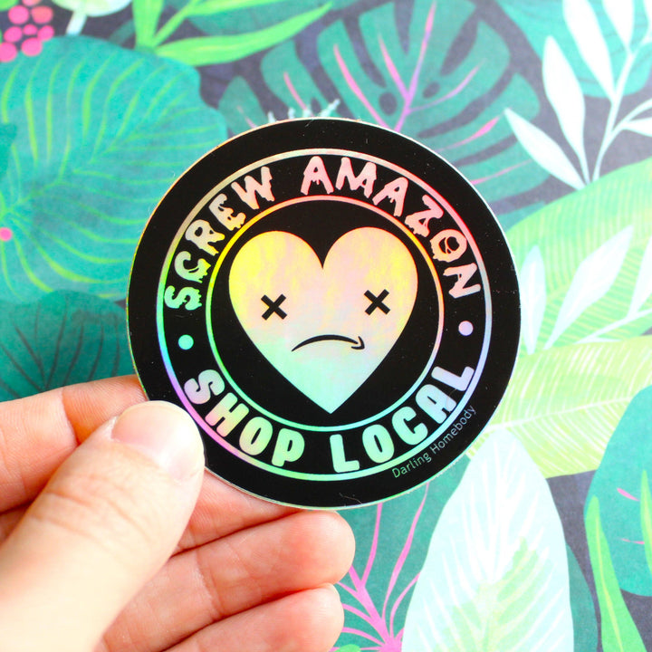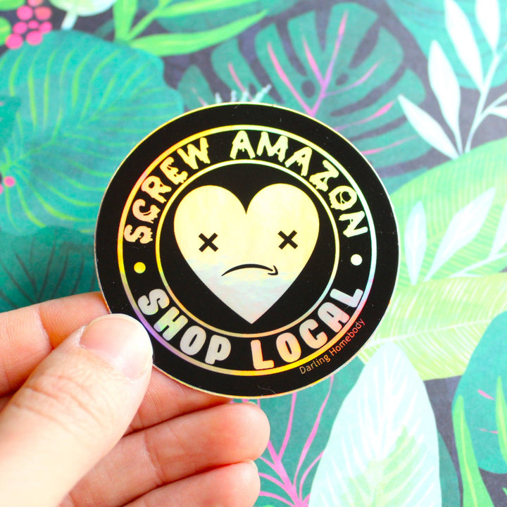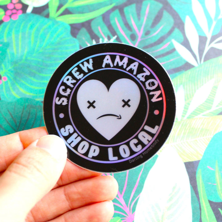 The Screw Amazon Shop Local Sticker, with its magical rainbow holographic effect and weatherproof decal, is perfect for spicing up your laptop, water bottle, car, or whatever needs a stylish and fun addition. Deciding to shop local has never been more cool!